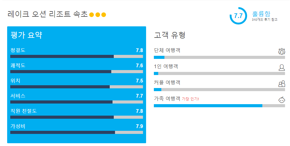 정말~ 깨끗하고, 조용하고 좋습니다~^^ 차량을 가지고 가족단위 여행하시는 분들에게 추천합니다. 속초시내 or 고성여행객에게 추천합니다.
