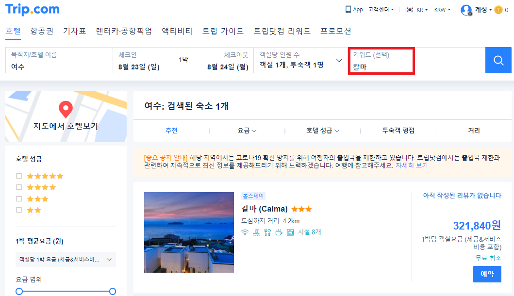 트립닷컴사이트에서 칼마를 검색하시면 여행날짜의 가격을