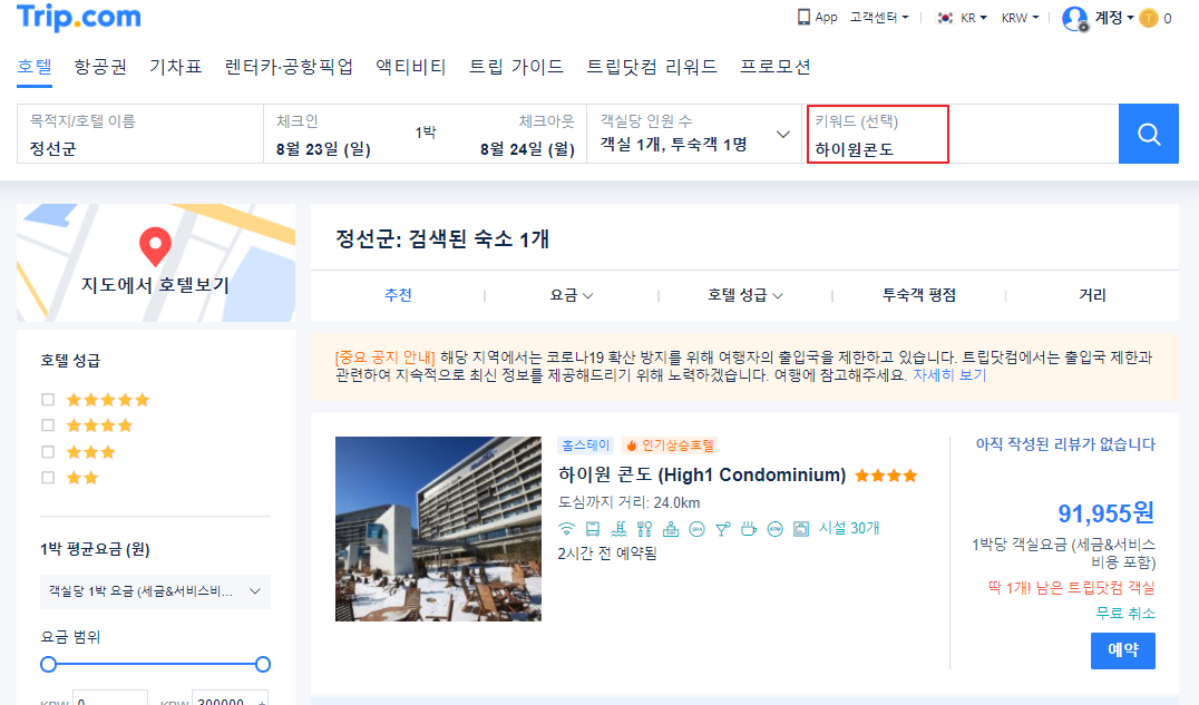 트립닷컴사이트에서 하이원콘도를 검색하시면