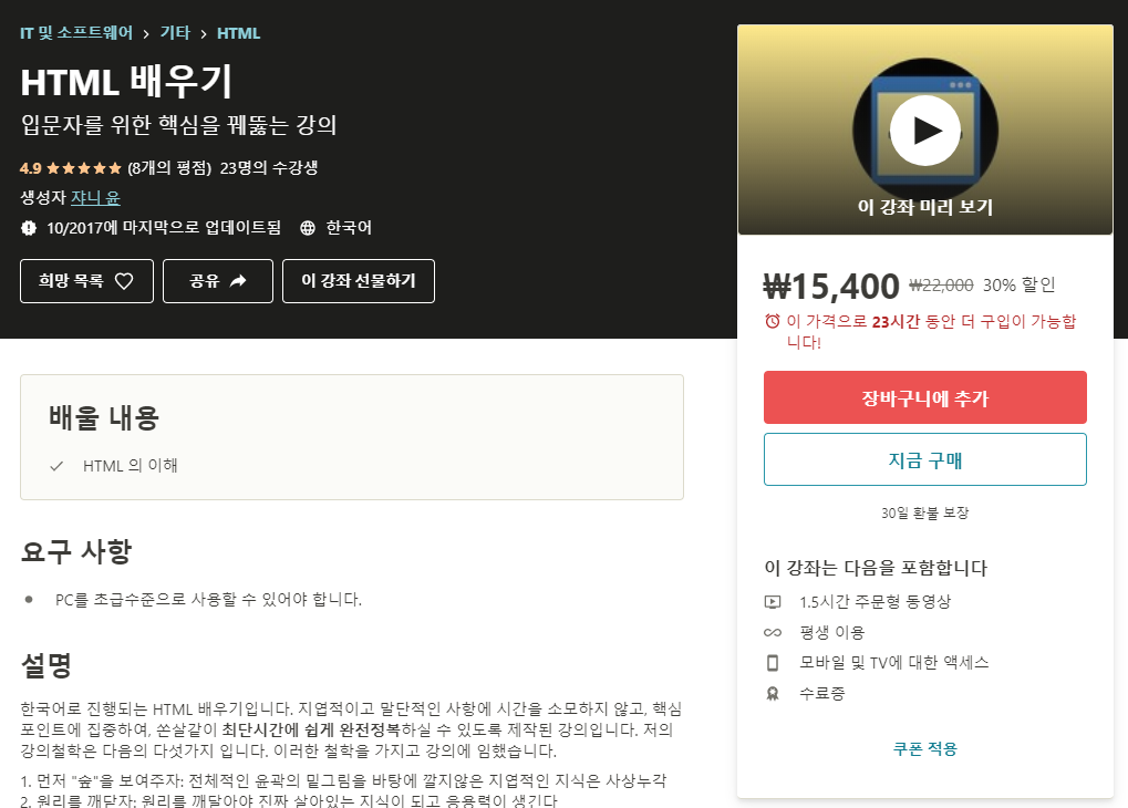 한국어로 진행되는 HTML 배우기입니다. 지엽적이고 말단적인 사항에 시간을 소모하지 않고, 핵심포인트에 집중하여, 쏜살같이 최단시간에 쉽게 완전정복하실 수 있도록 제작된 강의입니다. 저의 강의철학은 다음의 다섯가지 입니다. 이러한 철학을 가지고 강의에 임했습니다.