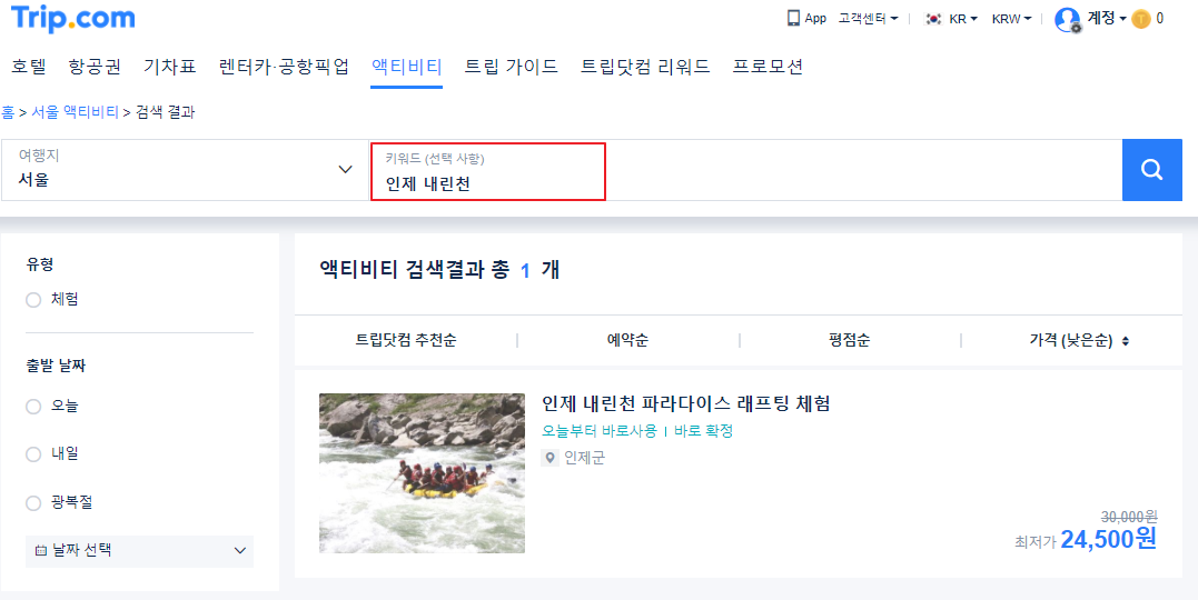 트립닷컴사이트에서 인제 내린천을 검색하시면