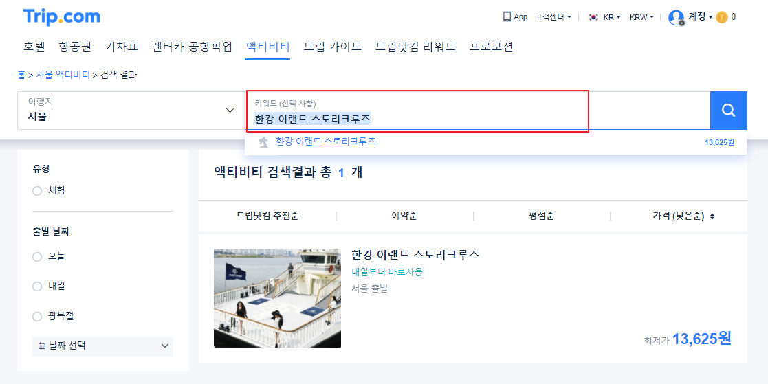 트립닷컴사이트에서 한강 이랜드 스토리크루즈를 검색하시면