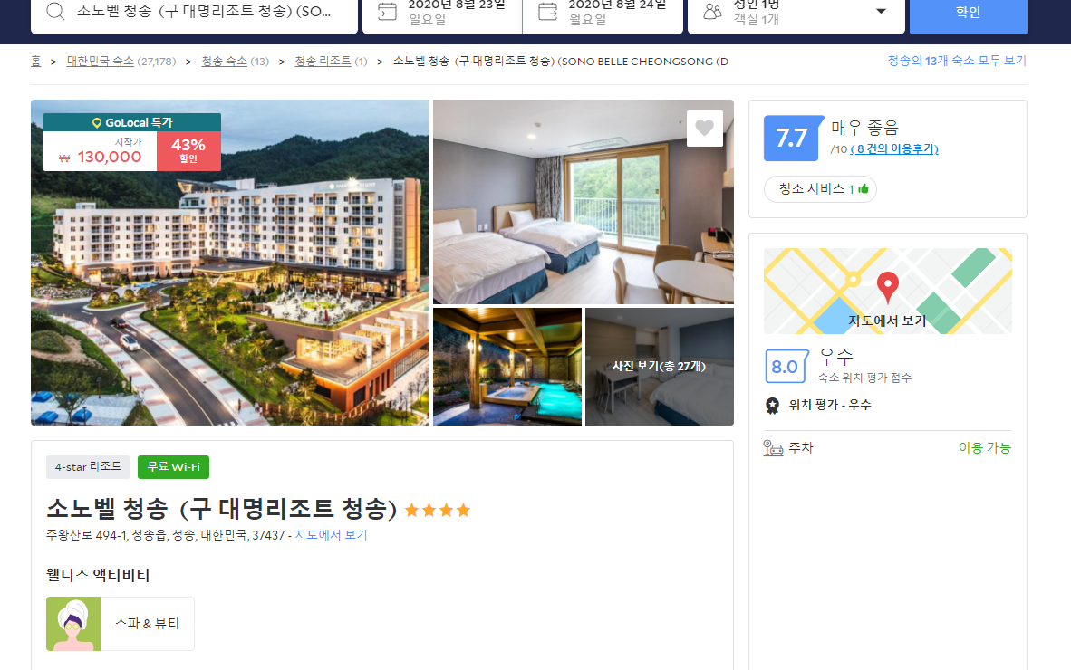 소노벨 청송 (구 대명리조트 청송) (SONO BELLE CHEONGSONG (DAEMYUNG RESORT CHEONGSONG))의 최저 가격대는 아고다에서 할인특가 가격으로 매일매일 변동되며 10만원대부터 다양하게 형성됩니다.아고다 최저가를 확인하시려면 아래 링크를 누르시면 원하는 날짜의 가격대를 자세히 보실 수 있습니다.