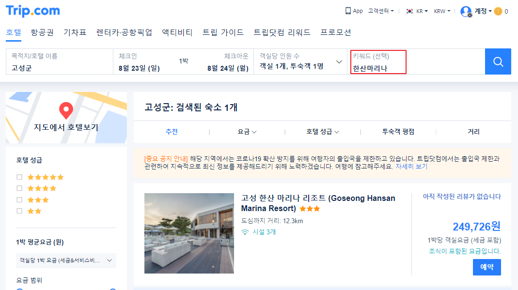 트립닷컴사이트에서 한산마리나를 검색하시면