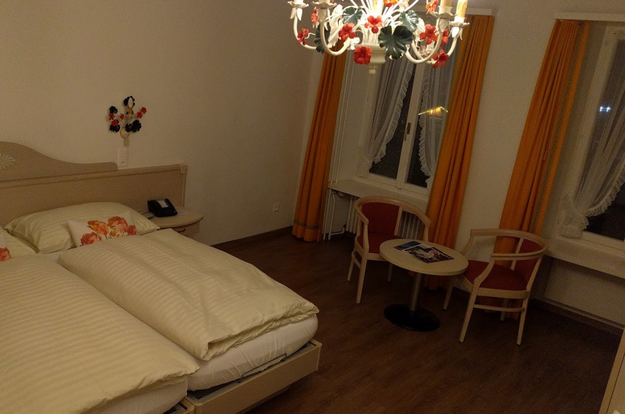 일단 조식포함이라 만족했고 오후엔 간식타임도 있어요. 간식이라고 해봐야 커피와 쥬스, 오렌지 파운드케이크가 다였지만 그거라도 잠시 앉아서 여유롭게 먹는 시간이 참 좋더라고요. 숙소 자체는 세월의 흔적이 너무나 뭍어나지만 청소나 관리는 나쁘지 않은 편이구요. 에어컨 없고요. 물끓일 수 있는 전기포트있고요. 하지만 체크인시 요리해먹지 말라고 되어있어서 참고하셔야할 것 같고요. 냉장고 작은거 하나 있는데 아무리 오래 넣어놔도 안시원해져서 거의 무쓸모.. 인터라켄 웨스트역에서는 기찻길건너 도보 6분 거리쯤? 인터라켄 웨스트역 자체는 위치가 참좋았고요. 번화가쪽 싫어하시는 분들에겐 여기 위치좋아요. 조용하고 사람 별로 안다니는 쪽이예요~ 조식도 매일 똑같았지만 그래도 괜찮은 편이예요. 처음엔 가격대비 별로라고 생각했지만 4박 묵었는데 묵을수록 괜찮다 생각되었어요. 참고바랍니다