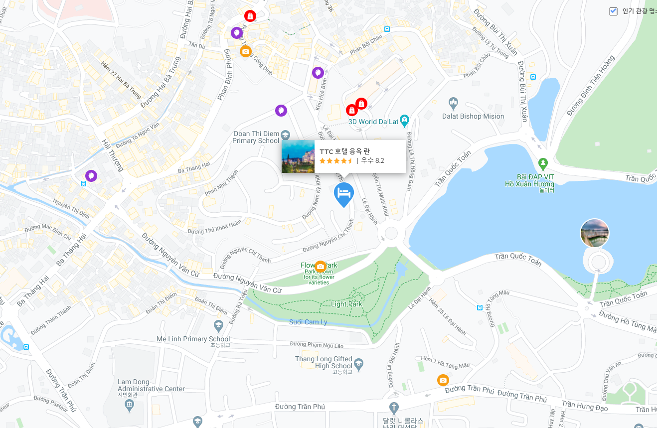 앞에 호수가 있고 달랏주요 관광지와도 가까이 있으며 특히 나이트마켓이 3분거리에 있습니다.