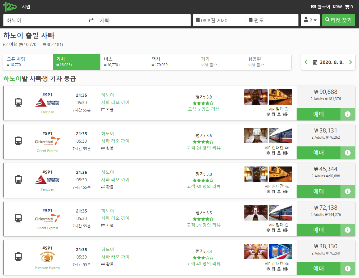 하노이에서 사파가는 기차출발 시간은 오후 21시부터 22시사이에 3대가 있으며,