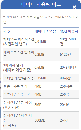 인터넷명 / 1건소모량 / 1GB 사용시 이용량