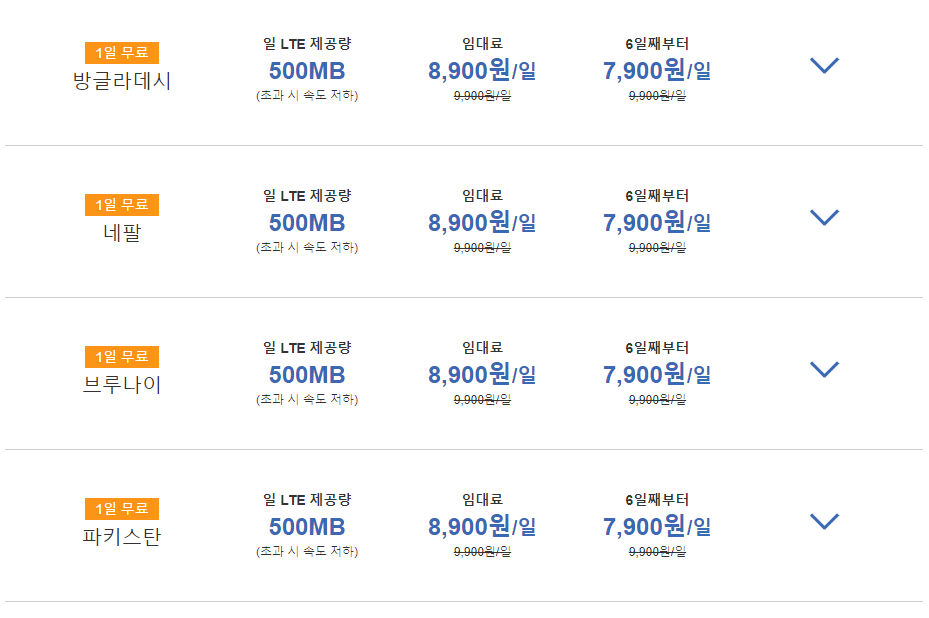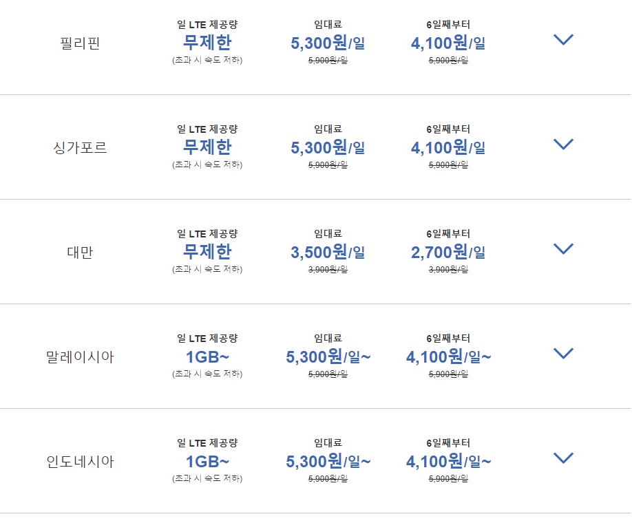 아시아지역 와이파이도시락 요금 예시