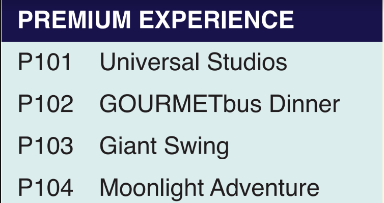 그리고 프리미엄 체험으로 GOURMETbus, 자이언트 스윙, 문라이트 어드벤처, 유니버셜 스튜디오 중