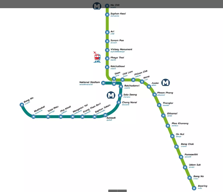 방콕 스카이트레인(BTS)은 파야타이(Phaya Thai) 역에서 공항철도(ARL)와 연결됩니다.