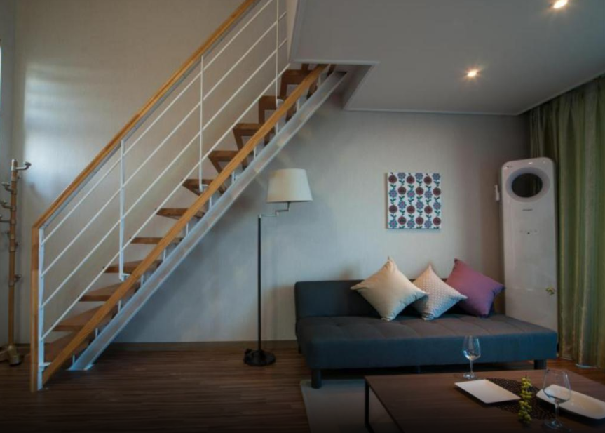 복층 구조로 된 방에 묵었음. 1층에 거실, 주방, 화장실 있고 다락방에 침실있었음. 주방에 간단한 조리기구 있어서 젓병 소독하기 편했음. 아이가 어려서 다락방에서는 잘 수 없었음. 대신 거실이 넓어 거실에서 아이와 넓게 잘 수 있었음. 객실은 깔끔하고 안락한 느낌이 듬. 창문으로 조금 멀리 바다가 보이고 앞에 작은 정원이 있음. 호텔근처에 바닷가와 올레길 산책하기 좋음. 호텔 근처 부둣가에 몇 몇 식당 있는데 비싸고 2인 분 이상씩 주문받아 2인 여행객들에게는 비추. 밥먹을 곳은 미리 검색해두고 가는게 좋음.
