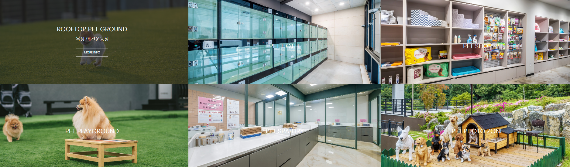 - 펫공간 : 펫호텔, 펫놀이터, 펫스파, 펫목욕, 드라이룸 등 펫케어 서비스