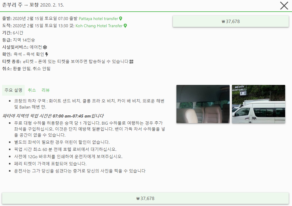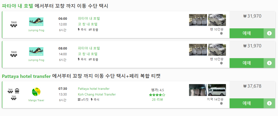 - 파타야 출발 꼬창 행 00:00 Pattaya Town 에서 00:00 Pattaya Town 까지 택시+페리 2