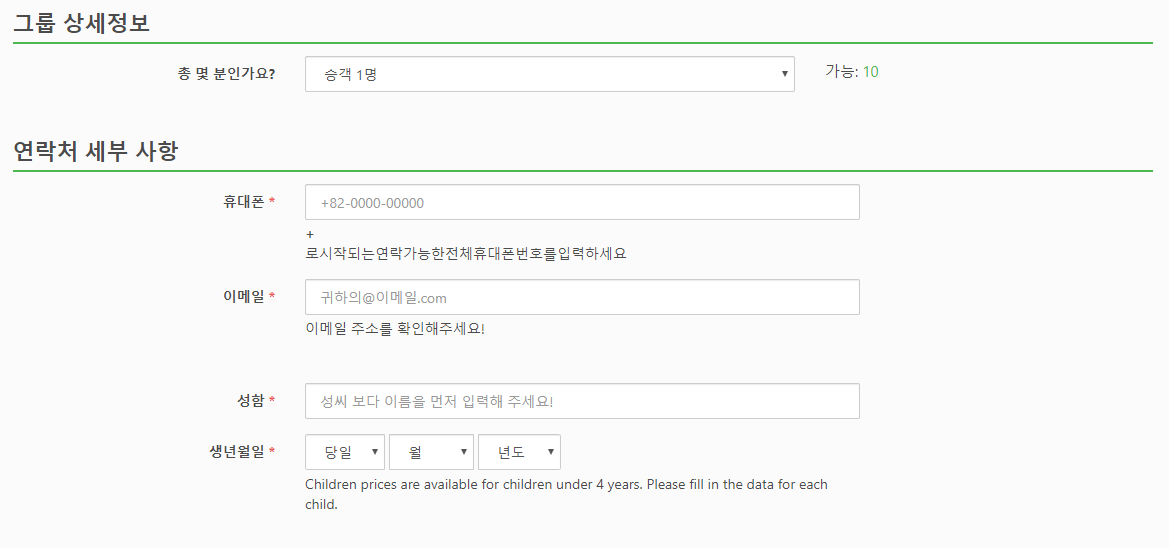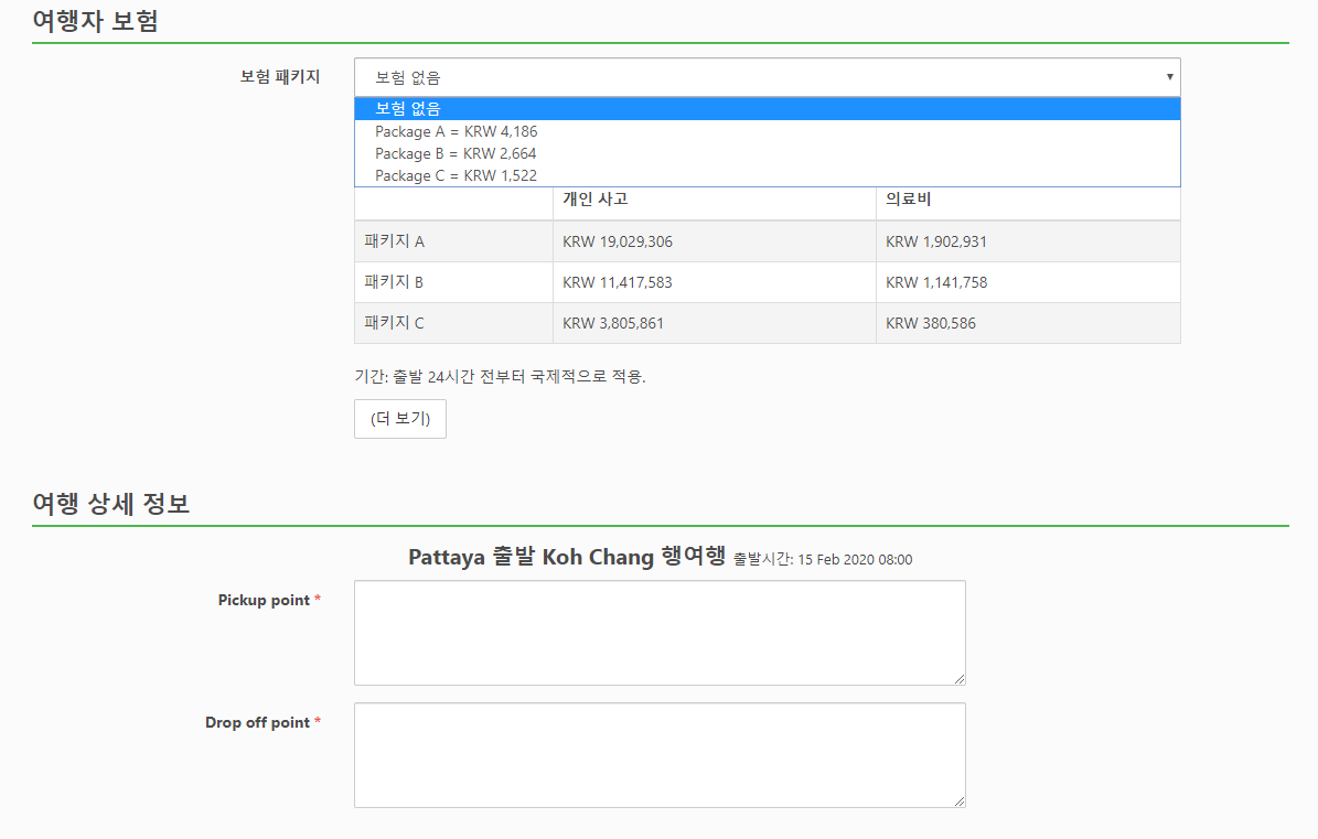 예약시에는 인원수, 핸드폰번호, 이메일, 이름/성, 생년월일을 입력하고 보험은 선택사항으로 선택하실 수 있습니다. 여행 상세정보에는 파타야시내 픽업하실 호텔명 및 주소, 그리고 코창내 목적지 호텔명과 주소를 입력하시면 됩니다.