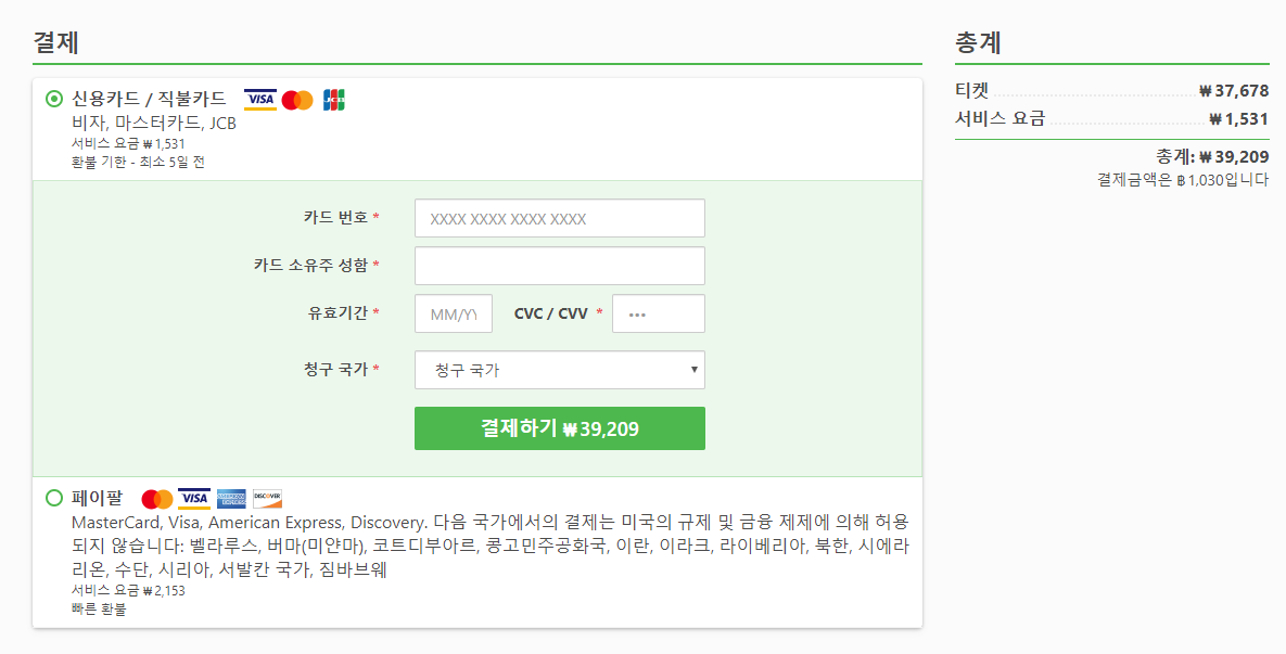 결제는 신용카드와 페이팔로 결제가 가능하며, 신용카드의 경우