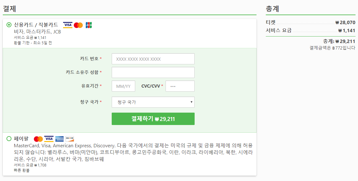 결제는 신용카드와 페이팔로 결제가 가능하며, 신용카드의 경우 티켓요금이