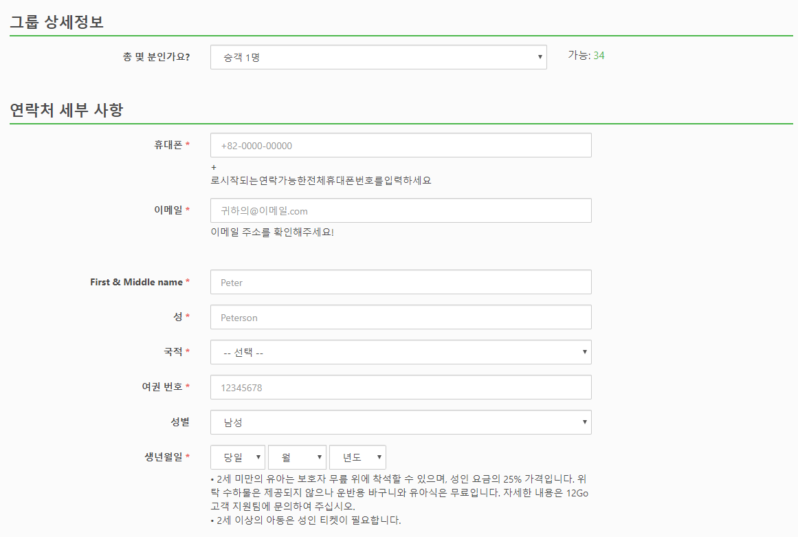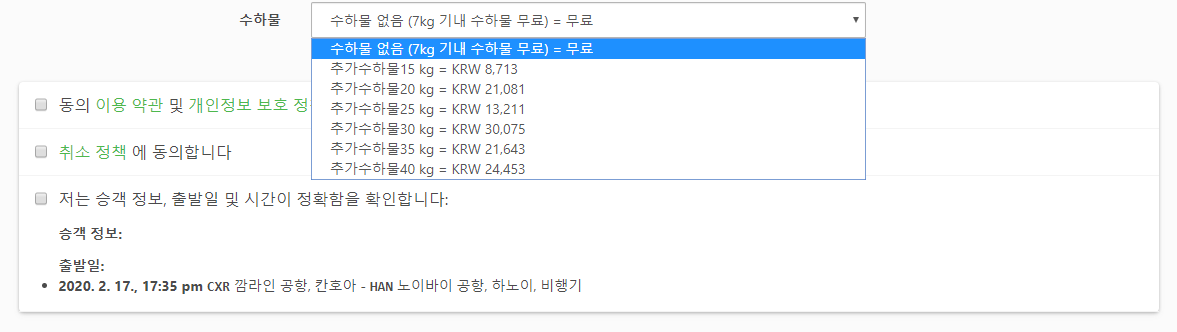 예약시에는 인원수, 핸드폰번호, 이메일, 이름, 성, 국적, 여권번호, 성별, 생년월일을 입력하고 수화물물 7kg이내의 기내수하물만 무료, 그외수하물은 추가하셔야합니다. 추가수하물요금은 20kg 기준 13,211원입니다.