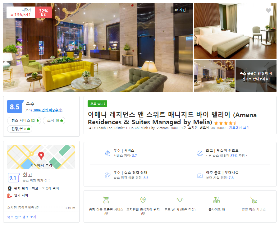 베트남 호치민여행의 호치민시내 시청광장과 호치민 일본인거리 접근성 좋은 위치의 호치민호텔 아메나 레지던스 앤 스위트 매니지드 바이 멜리아 (Amena Residences & Suites Managed by Melia)는 호치민시내를 여행하기 좋은 위치의 호텔로 주변에 이동하기도 편하고, 깨끗해서 휴식을 취하기 좋은 분위기입니다.