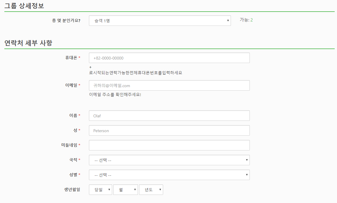 예약시에는 인원수, 핸드폰번호, 이메일, 이름, 성, 국적, 성별, 생년월일을 입력하면 됩니다.