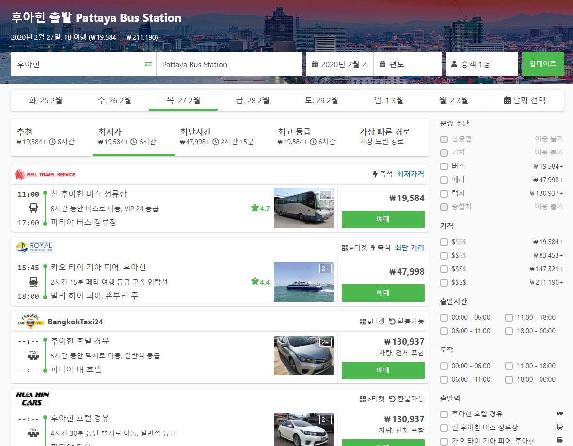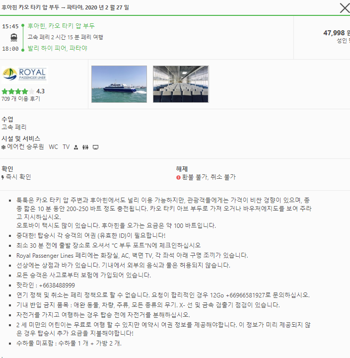 버스는 6시간 정도 이동시간이 소요되고, 19,584원에 이용하실 수 있으며, 페리는 2시간 15분소요, 47,998원정도 비용이 듭니다. 택시는 후아힌원하는 장소에서 픽업하고 파타야내 호텔로 이동할 수 있는 장점이 있으며 시간은 5시간정도 요금은 130,937원정도 듭니다.