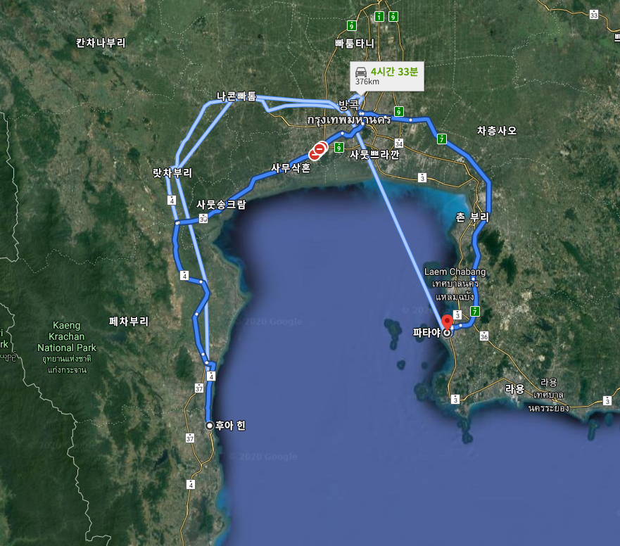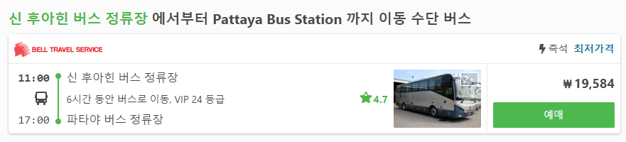 버스의 경우 신 후아힌 버스 정류장(New Hua Hin Bus Station)에서 타실 수 있고, 파타야 버스 정류장(Pattaya Bus Station)에서 내리시면 됩니다. 차량은 오전 11시에 출발해서 파타야에 17시도 도착합니다.