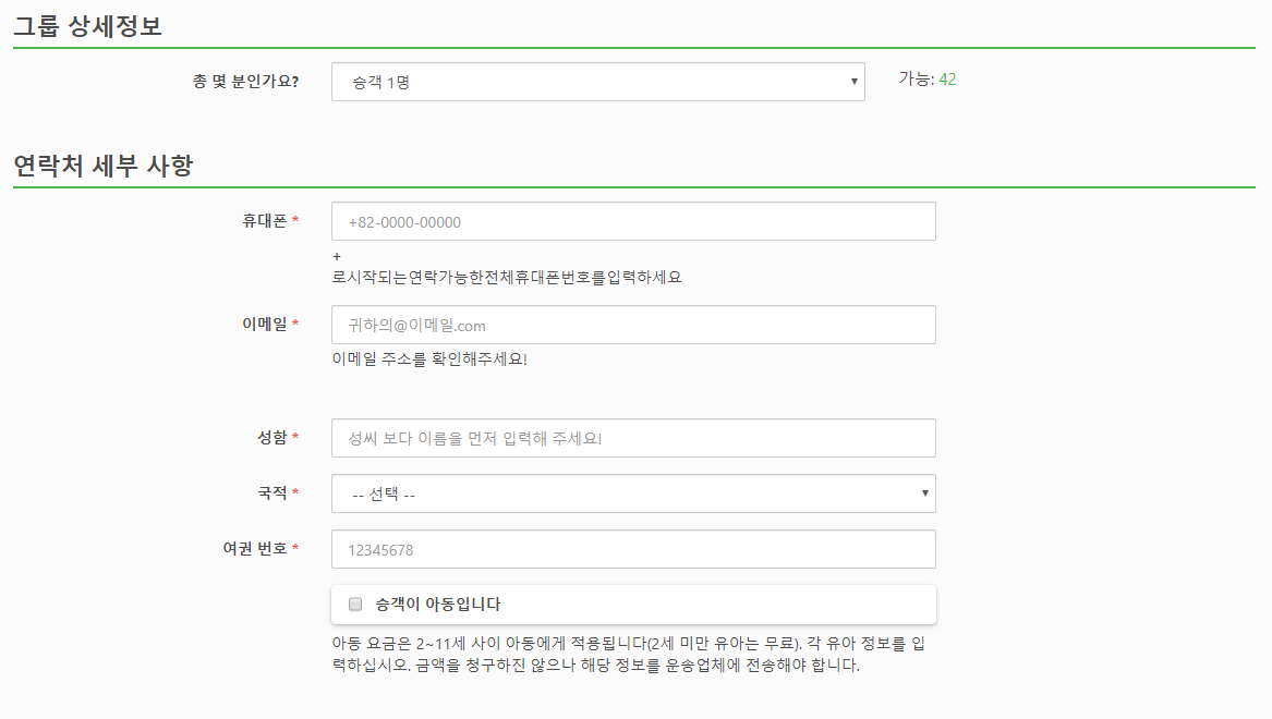 예약시에는 인원수, 핸드폰번호, 이메일, 이름/성, 국적, 여권번호를 입력하고, 여행자보험은 선택사항입니다.
