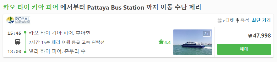 후아힌에서 파타야로 이동하는 페리는 후아힌 카오타이키아피어(Khao Ta Kiab pier)에서 타실수 있으며, 파타야 촌부리주 발리하이 피어(Bali Hai Pier)로 이동합니다. 시간대는 오후 15시 45분에 출발해서 18시에 파타야에 도착합니다.