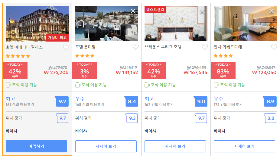 리스본호텔 아베니다 팔라스 (Hotel Avenida Palace)의 최저 가격대는 아고다에서 할인특가 가격으로 매일매일 변동되며 10만원대부터 다양하게 형성됩니다.아고다 최저가를 확인하시려면 아래 링크를 누르시면 원하는 날짜의 가격대를 자세히 보실 수 있습니다.