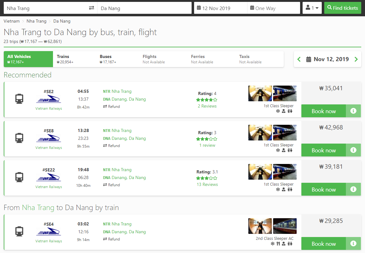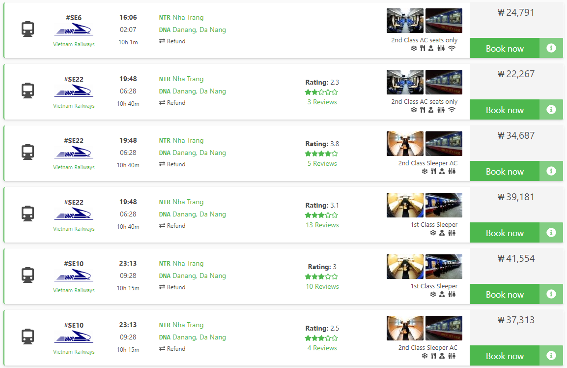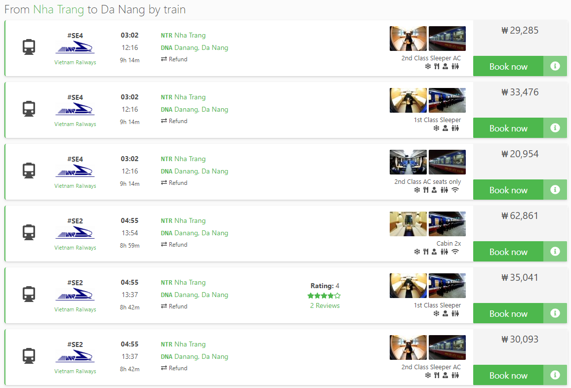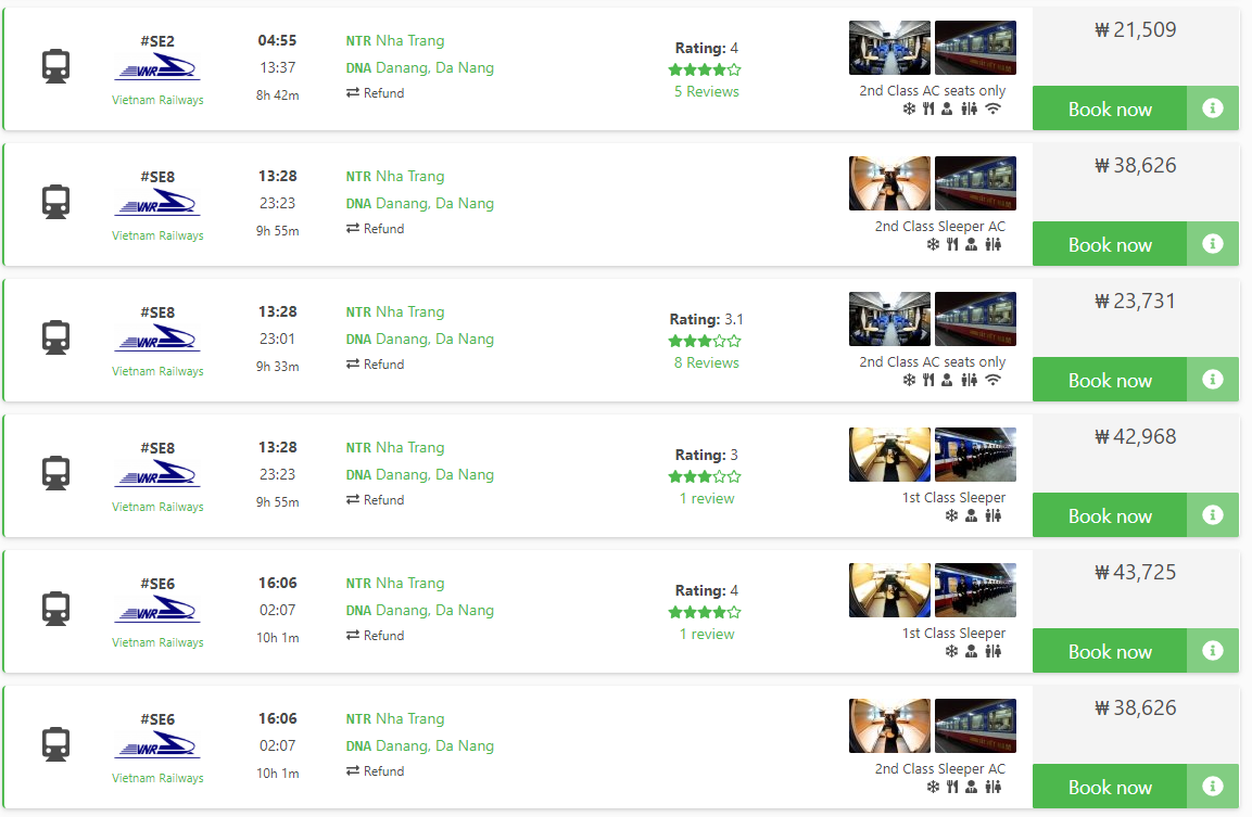 나트랑에서 다낭으로 이동하는 기차는 나트랑기차역에서 다낭기차역으로 이동하며, 가격은 최저 21,509원 부터 좌석등급이나 시간에 따라 가격이 틀립니다. 이동시간은 8시간 30분에서 ~ 10시간 30분정도입니다.
