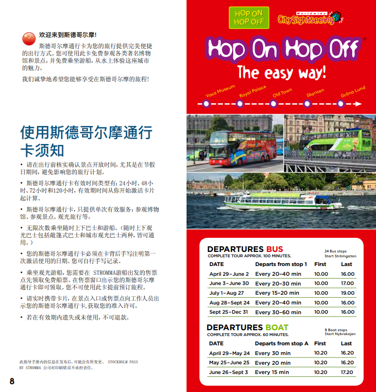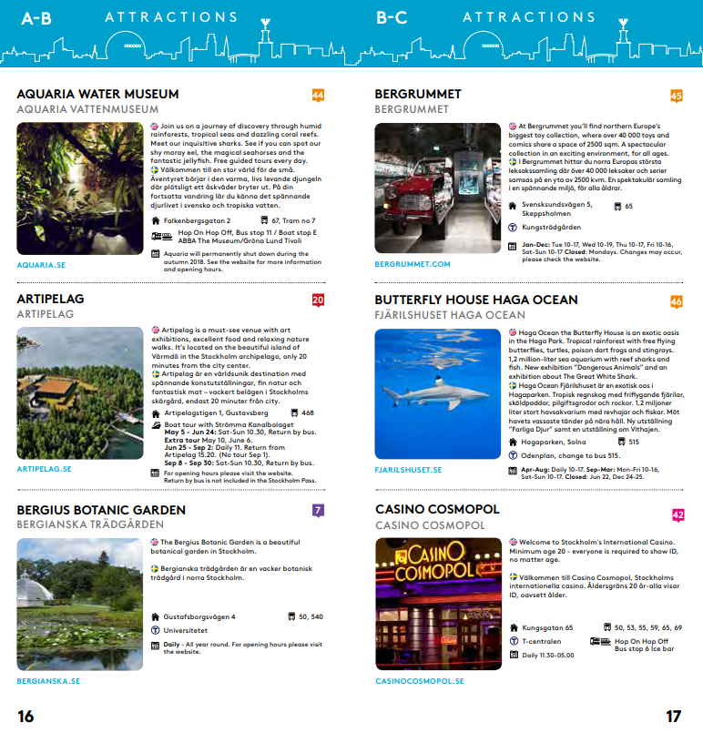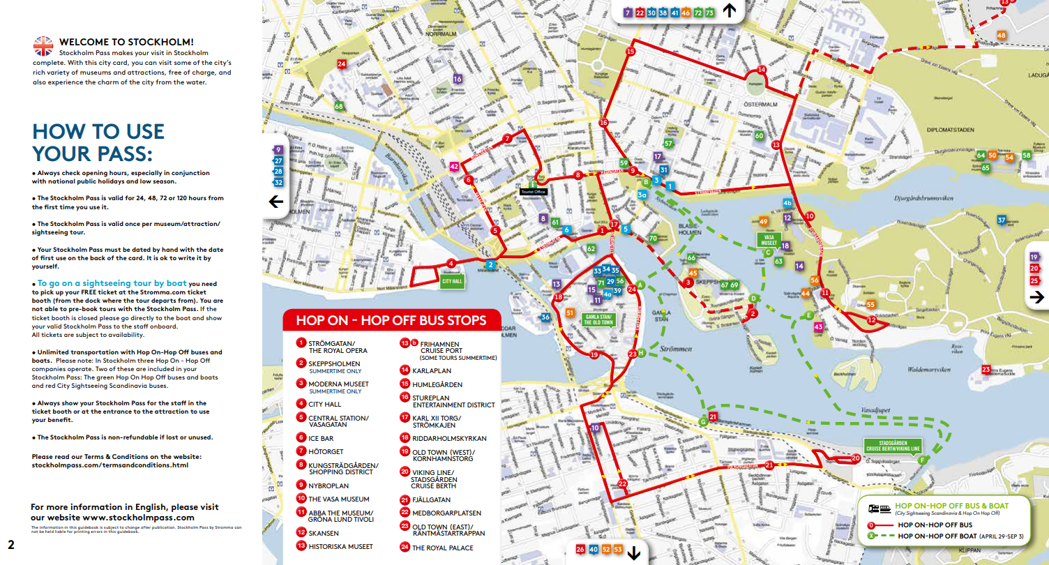 스톡홀름 패스에 포함되어 있는 어트랙션, 버스, 보트에 대한 자세한 정보 및 어트랙션 운영 시간과 가는 방법이 수록된 가이드북