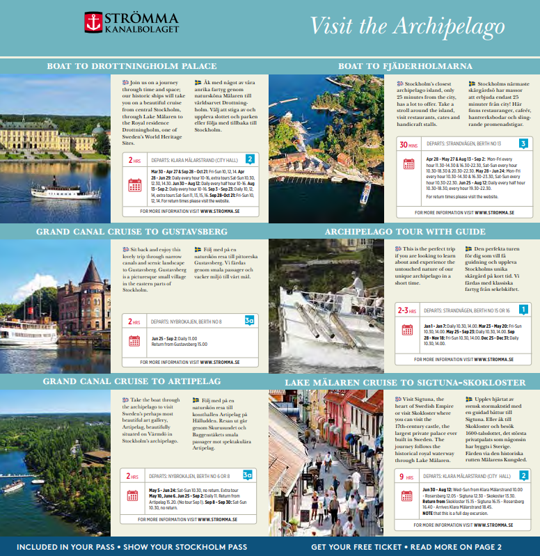 보트 투어에 참여하면 아름다운 스톡홀름 군도와 마라렌 호수에서 잠시 여유를 만끽할 수도 있습니다. 여러 관광지와 명소에 대한 팁, 관광 정보, 지도 등이 수록된 가이드북도 무료로 제공해드립니다.