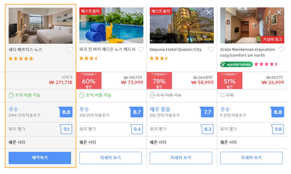 마닐라 세다 베르티스 노스 호텔(Seda Vertis North)의 최저 가격대는 아고다에서 할인특가 가격으로 매일매일 변동되며 20만원대부터 다양하게 형성됩니다. 아고다 최저가를 확인하시려면 아래 링크를 누르시면 원하는 날짜의 가격대를 자세히 보실 수 있습니다.