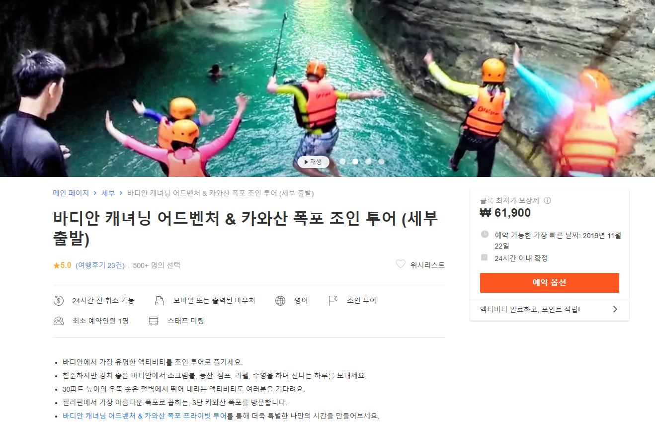 교통편이 불편한 만큼 세부에서 출발하는 투어에 참여를 원하는 분들은 바로 아래 링크한 투어에 참여하시는 것이 좋을 것 같네요 ~~~ 바디안 캐녀닝 입장권과 현지 가이드 투어는 미팅장소에서 점프포인트까지 오토바이 교통편, 캐녀닝입장권, 캐녀닝 안전장비(구명조끼 및 헬멧), 전문 현지 영어가이드, 아쿠아슈즈, 식사 등이 포함되어 있습니다.