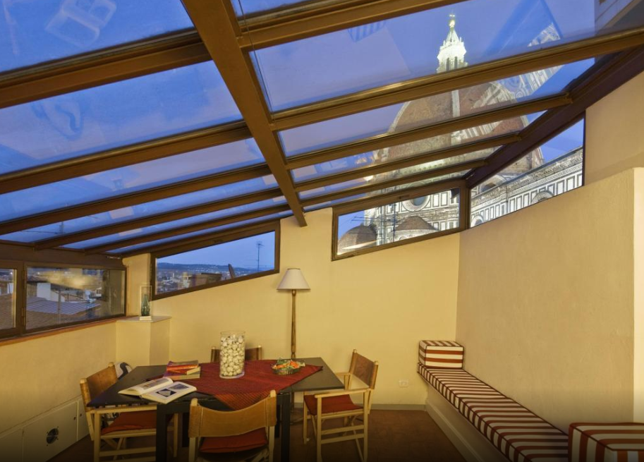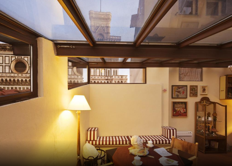 피렌체 머무르는 동안 지냈던 숙소. 두오모 성당 바로 앞에 위치하고 있고, 보안도 비교적 잘 되어 있는 편임. 건물 메인 문을 두 번 열고 들어가면 매우 작은 리셉션이 나오는데, 주인 아주머니가 아침 8시 반 ~ 오후 4시까지 상주하고 있음. 주인 아주머니 인상 정말 좋고 친절함. 하지만, 오후 4시 이후에는 퇴근 해버리시기 때문에 직원이 24시간 있기를 바라는 사람은 추천하지 않음. (하지만 직원이 없다는 것에 대해 불편한 점은 전혀 없었음) 두오모 성당 예약권을 출력 해 가지 않았는데 요청하니 바로 출력해줌. 방이 넓고 깨끗하고, 주방이 별도로 있는 아파트먼트로, 관리가 매우 잘되어 있음. 조식 제공 플랜으로 적혀있지만, 차려주는 식사는 아니고, 방 테이블의 과일, 주방의 시리얼, 빵, 우유, 주스, 요거트, 물 등을 무료로 이용할 수 있으며, 아침에 문고리에 크로와상이 걸려져 있음. 4층 꼭대기 스카이 라운지와 1층 공용거실을 마음껏 이용할 수 있으며, 공용거실에 있는 와인과 커피, 물도 무제한 이용 가능. 특히 커피머신에서 내려지는 캡슐커피가 완전 맛있음. 두오모 성당 바로 앞에 있기 때문에 여행 도중 화장실이 가고 싶을 때 유용함. 와이파이 연결이 잘 되지 않는 것이 유일한 단점. 가장 저렴한 플랜은 두오모 성당 뷰가 아니므로 참고하여 예약할 것.