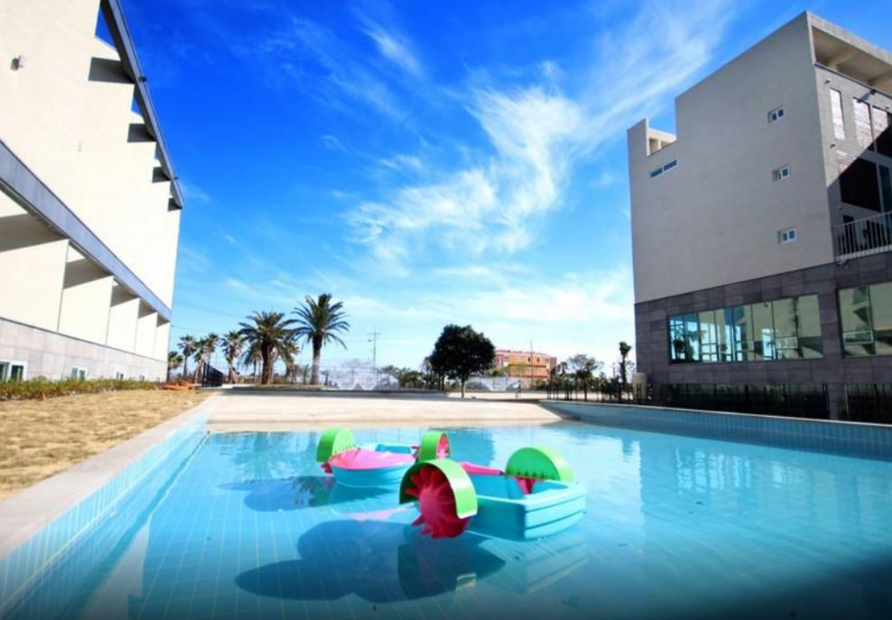 위치가 좋아요. 숙소 바로앞이 해안도로이고, 차로 10분정도면 성산일출봉까지 갈수 있어요. 부대시설로 카페,펍,편의점이 있고 수영장도 아이들 놀기 딱이에요. 세탁 무료에 건조대까지 무료 대여입니다. 완전 가성비 갑인듯