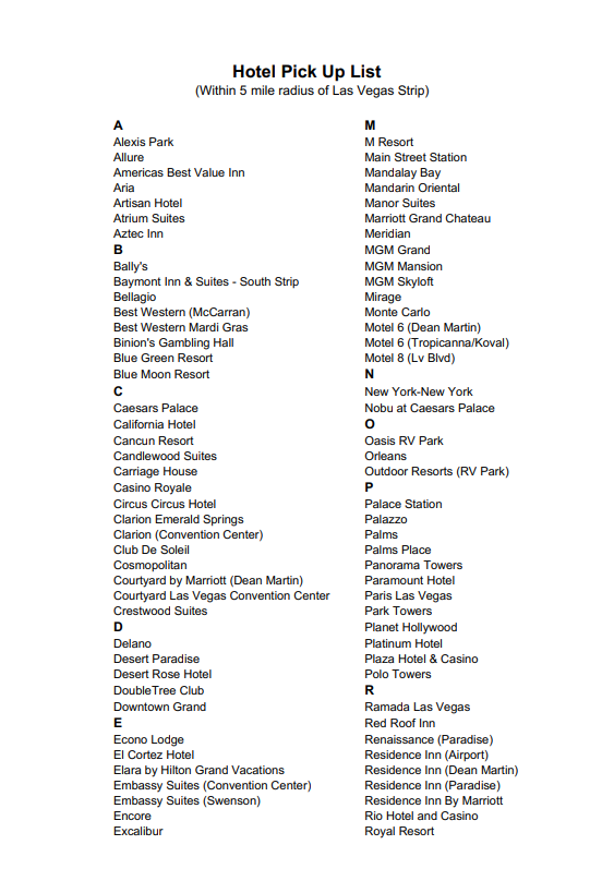 특정 호텔에 한해 왕복 리무진 이동 서비스를 이용할 수 있습니다. 예약시 호텔명/주소를 적어주세요. 현지 담당자가 사전에 가장 가까운 픽업 장소를 안내해 드립니다. 호텔 픽업 목록을 참고하세요.