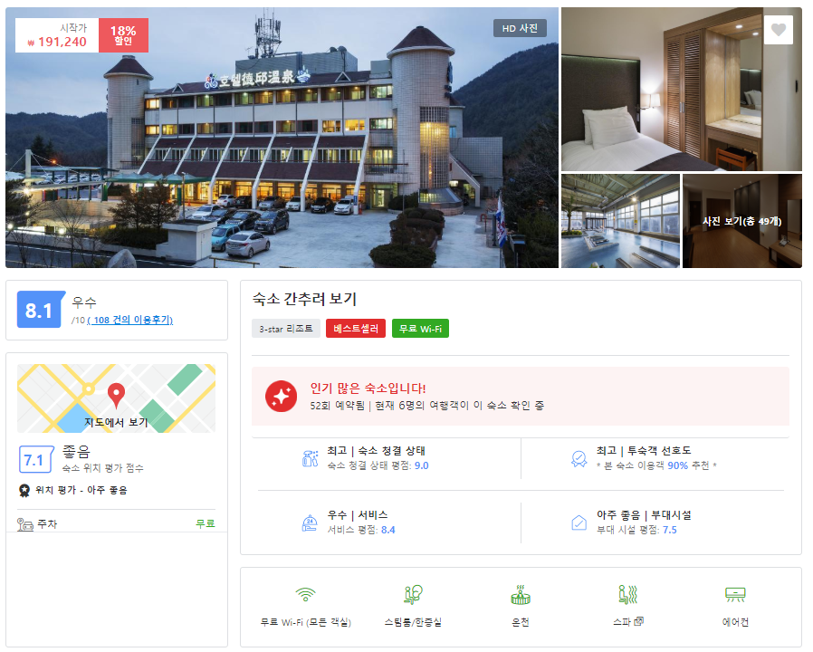 온천수가 정말 좋은 휴양호텔입니다. 위치가 좀 외지긴 하지만, 국내 최고의 온천수를 느낄 수 있습니다. 객실청소상태도 좋고 주차장도 넉넉합니다.