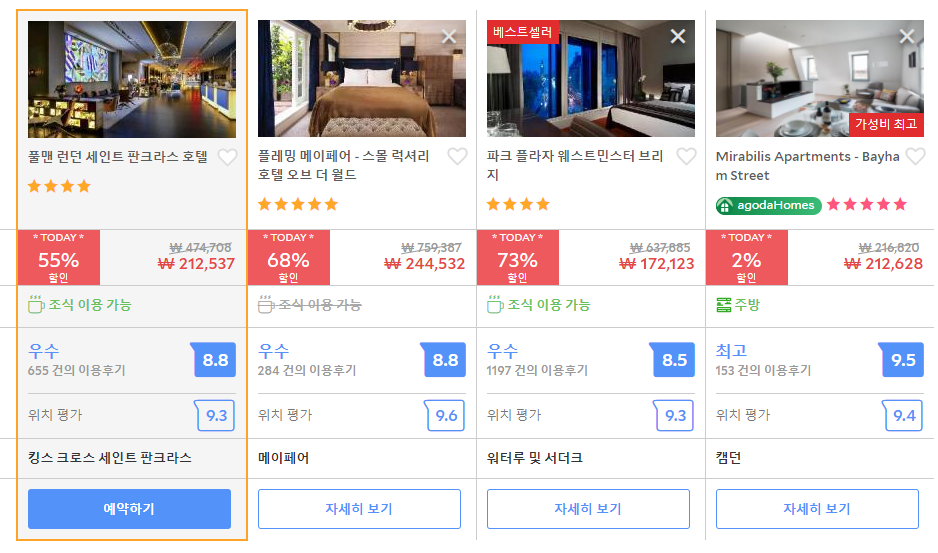풀맨 런던 세인트 판크라스 호텔 (Pullman London St Pancras Hotel)의 최저 가격대는 아고다에서 할인특가 가격으로 매일매일 변동되며 10만원대부터 다양하게 형성됩니다.아고다 최저가를 확인하시려면 아래 링크를 누르시면 원하는 날짜의 가격대를 자세히 보실 수 있습니다.