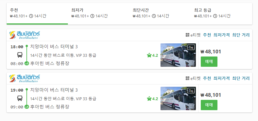 버스 시간대는 18:00 와 19:00에 출발하는 노선이 있으며, 도착은 오전 8시, 9시입니다.