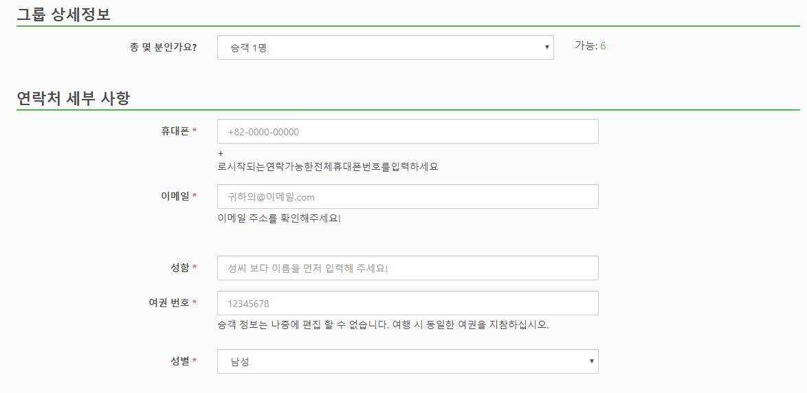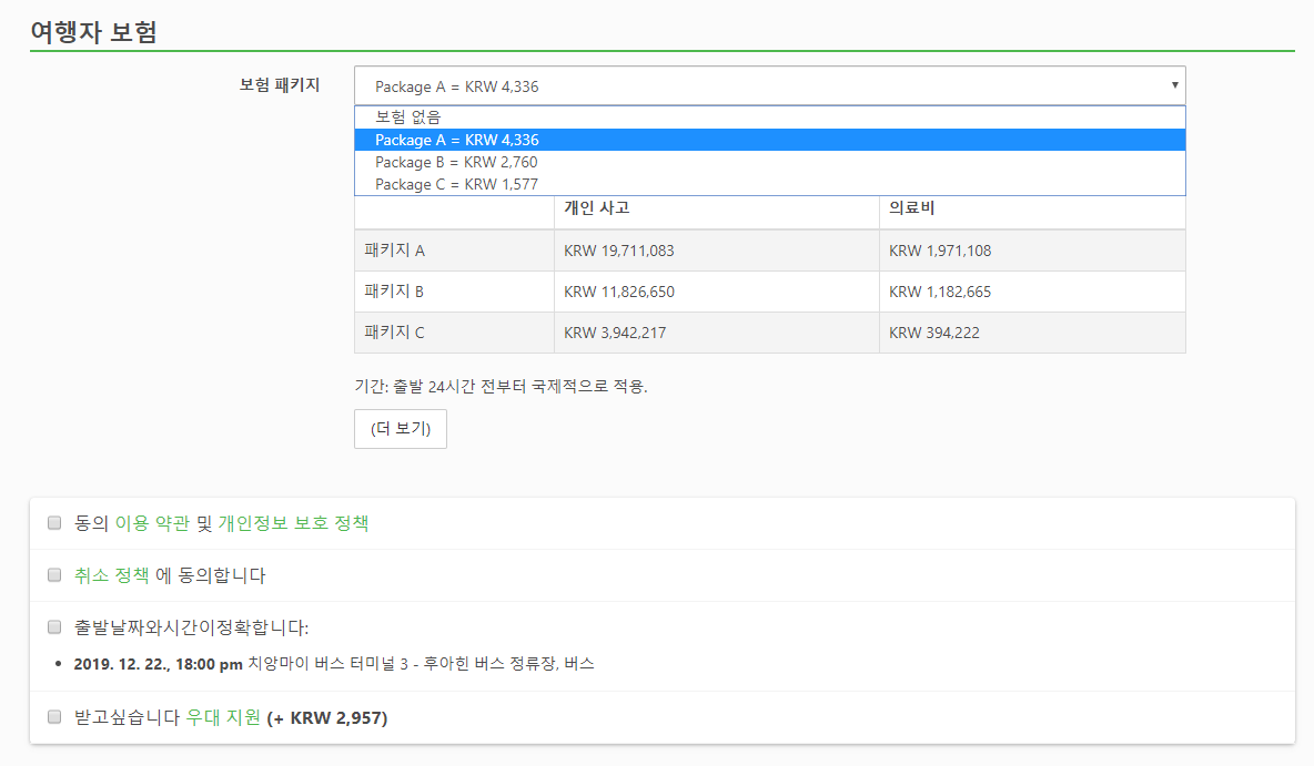 예약은 현지 온라인 사이트에서 쉽게 예약하실 수 있으며, 한국어 페이지도 있습니다. 예약시에는 예약인원, 휴대폰 이메일, 성명, 여권번호, 성별을 입력하고, 여행자보험은 선택사항입니다.