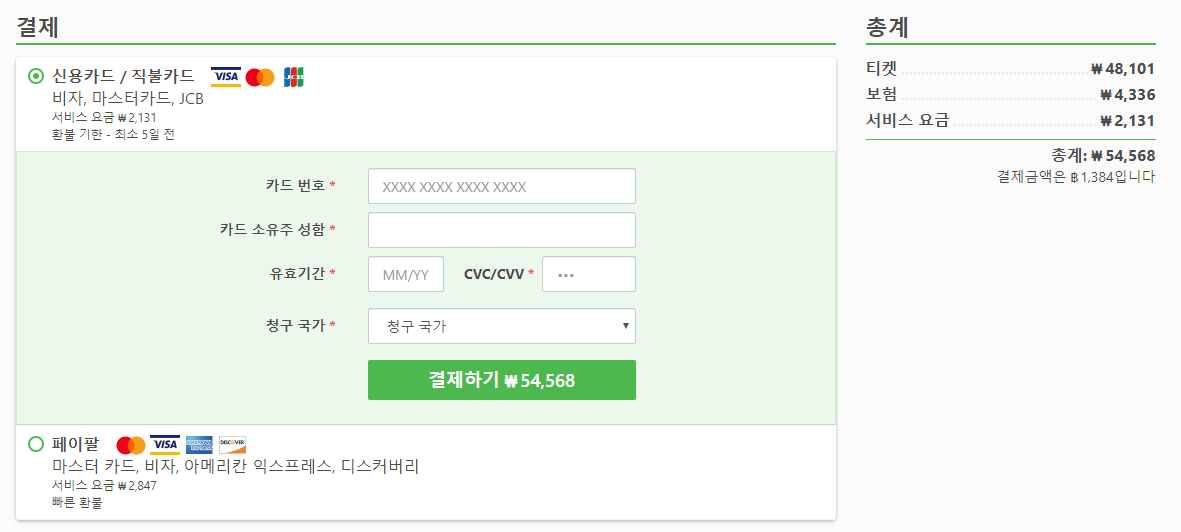 결제는 비자, 마스터카드, JCB 신용카드 또는 페이팔로 결제 하실 수 있으며, 티켓요금이 48,101원일 경우 신용카드는 2,131원의 결제 수수료가, 페이팔은 2,847원의 결제 수수료가 붙습니다.