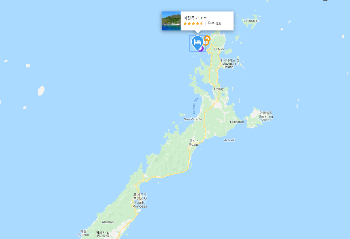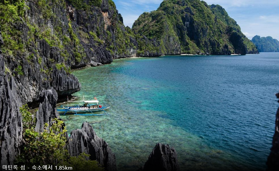 팔라완여행에 프에르토 프린세사에서 엘니도시내로 이동하여 엘니도 부두에서 배를 타고 들어 가야하는 마틴록 리조트 (Matinloc Resort)는 아름다운 작은섬에 있는 리조트로 바로 앞에 아름다운 바다에서 바로 스노클링도 즐길 수 있는 산호와 물고기가 많은 천혜의 자연을 자랑하는 곳입니다.