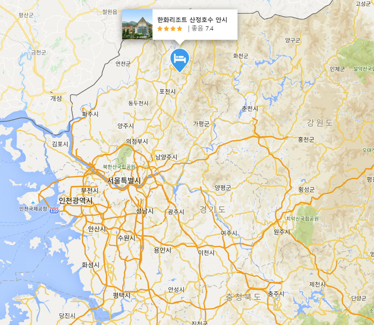 포천에 있는 한화리조트 산정호수 안시 (Hanwha Resort Sanjeong Lake Annecy)는 포천시 및 그 주변을 둘러보기에 완벽한 위치에 있습니다. 한화리조트 산정호수 안시 (Hanwha Resort Sanjeong Lake Annecy)에서 생동감 넘치는 도시의 많은 것을 최대로 즐길 수 있습니다. 한화리조트 산정호수 안시 (Hanwha Resort Sanjeong Lake Annecy)는 도시의 필수 관광 명소에 손쉽게 접근할 수 있는 편리한 위치를 자랑합니다.