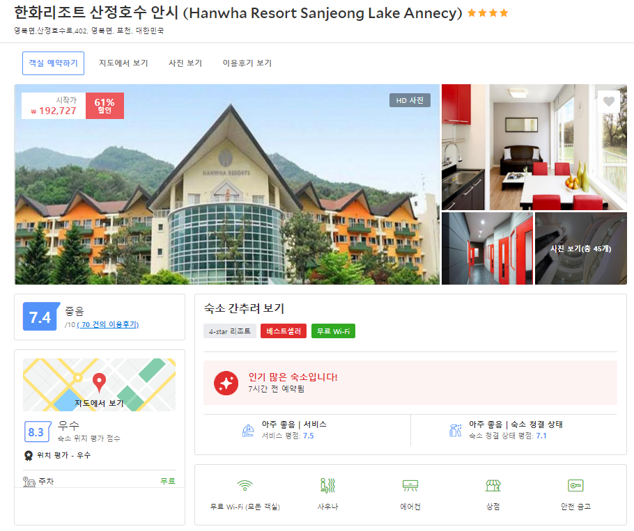 한화리조트 산정호수 안시 아고다 최저가 자세히 보기