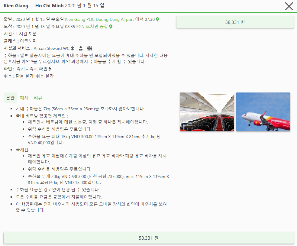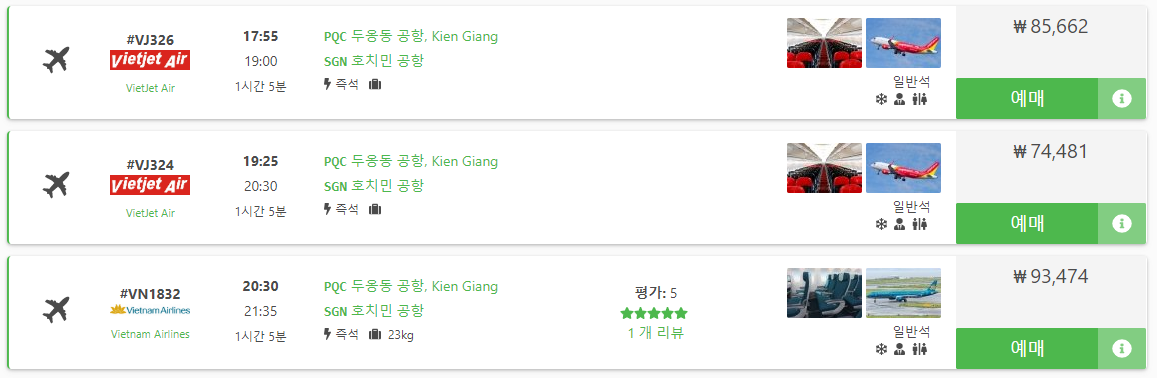 시간대는 오전 6시 35분부터 20시 30분까지 다양하게 있으며, 최저항공요금은 5만원대로 vietjet air의 오전 6시 35분, 7시 30분행기가 가장 절렴합니다.