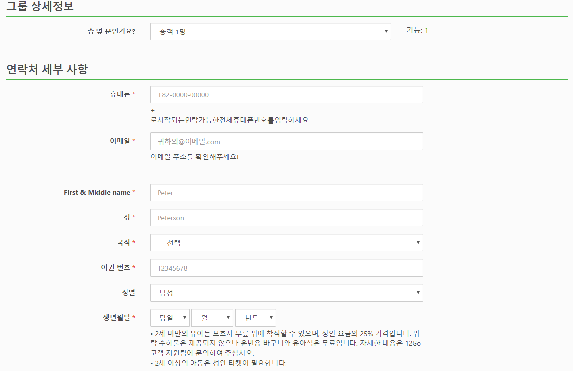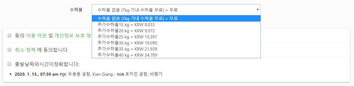 예약은 현지 온라인 사이트에서 쉽게 예약하실 수 있으며, 한국어 페이지도 있습니다.(한국어 페이지는 2019년 7월 오픈) 예약은 예약인원, 모바일번호, 이메일, 이름, 성, 국적, 여권번호,성별, 생년월일을 입력하고, 수하물은 기내반입수하물만 무료이며, 7 kg이하입니다. 선택사항을 15kg ~ 40kg까지 추가요금으로 이용하실 수 있습니다. 30kg 정도에 19,090원 정도입니다.