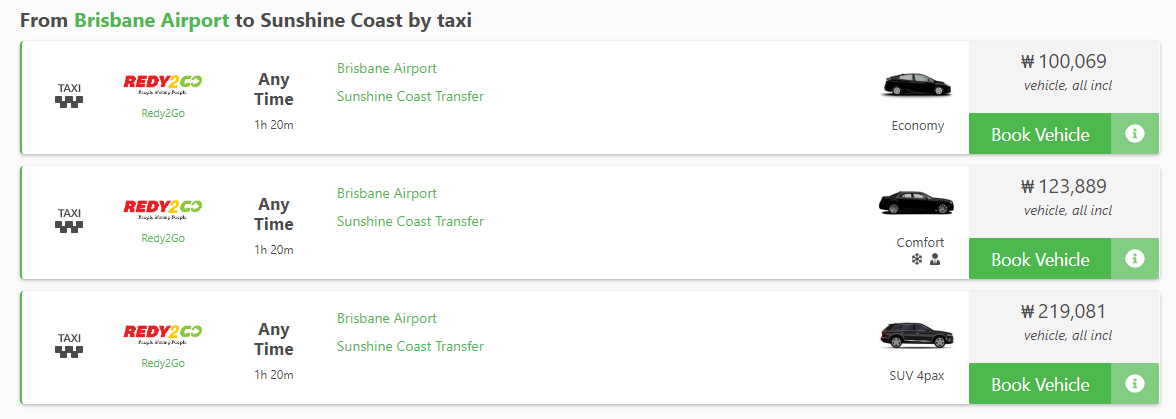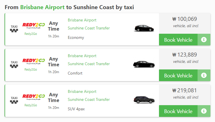 버스외에도 브리즈번 공항에서 선샤인코스트 호텔로 이동할 수 있는 택시 교통편도 있으며,