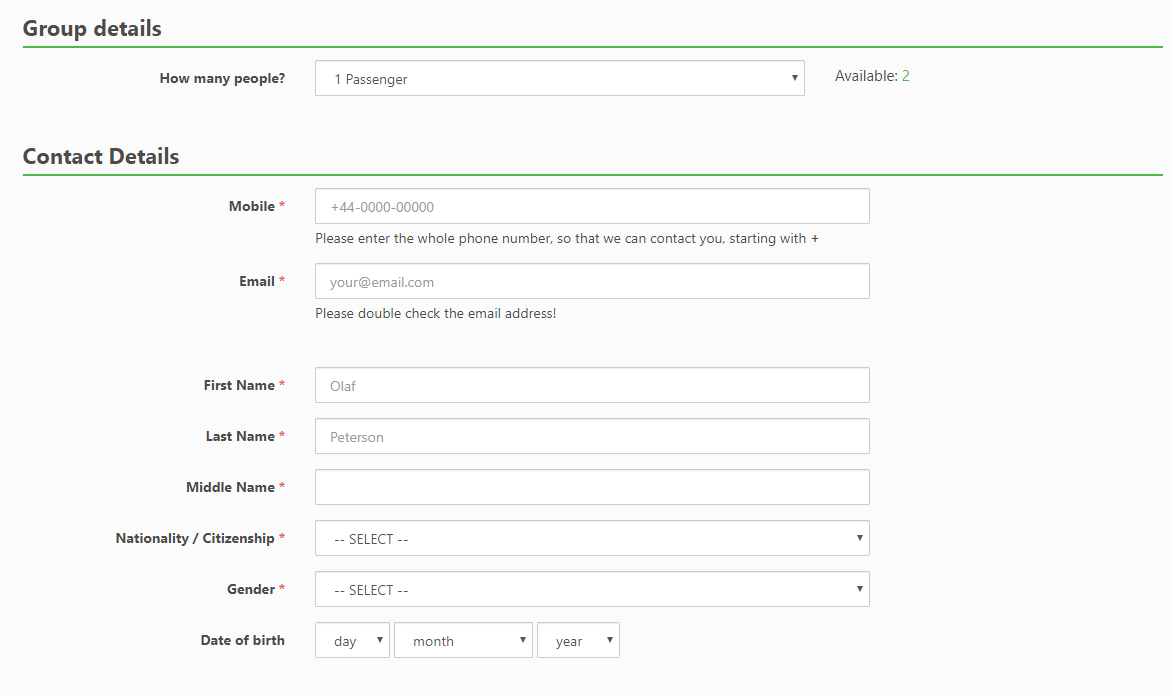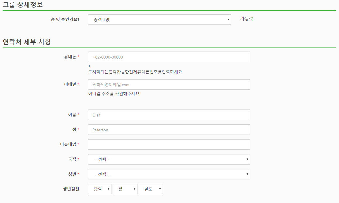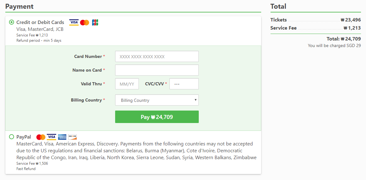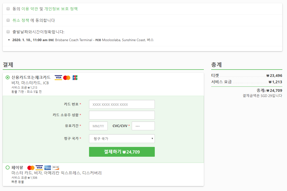 예약시에는 인원인원, 모바일번호, 이메일, 이름, 성을 입력하고 국적, 성별, 생년월일을 입력하고 결제는 신용카드 또는 페이팔로 결제가 가능하며, 신용카드의 경우 티켓요금이23,496원이면 결제수수료 1,213원이 추가로 결제됩니다. 페이팔의 결제수수료는 1,506원입니다.
