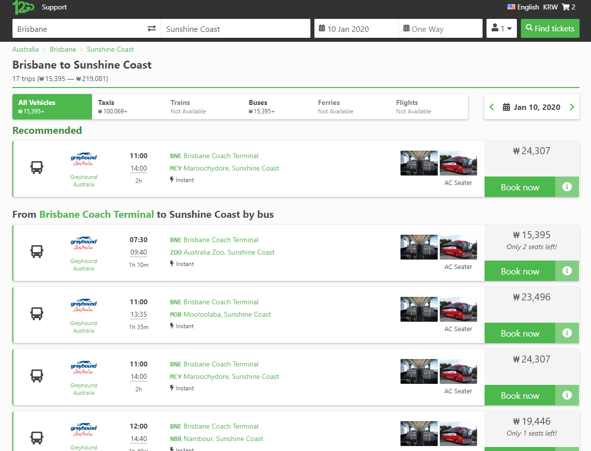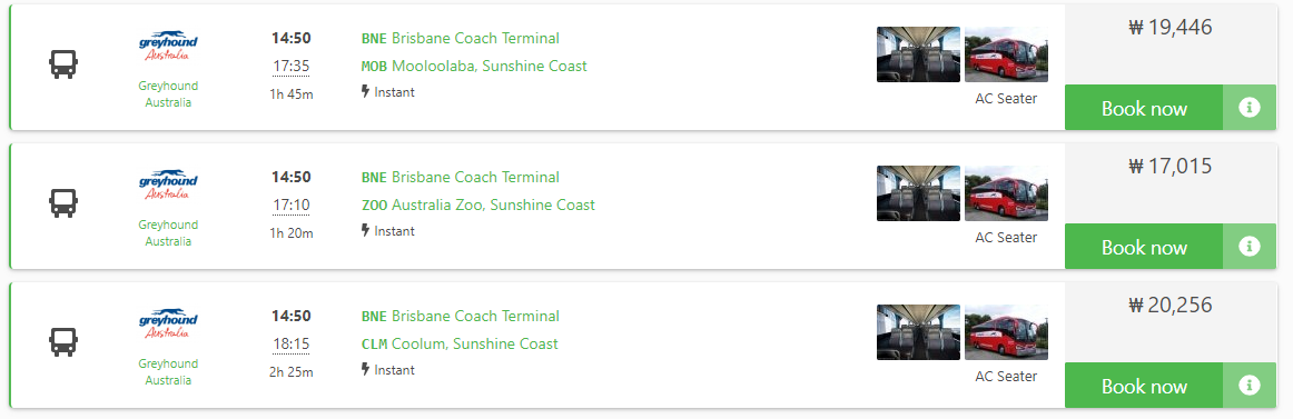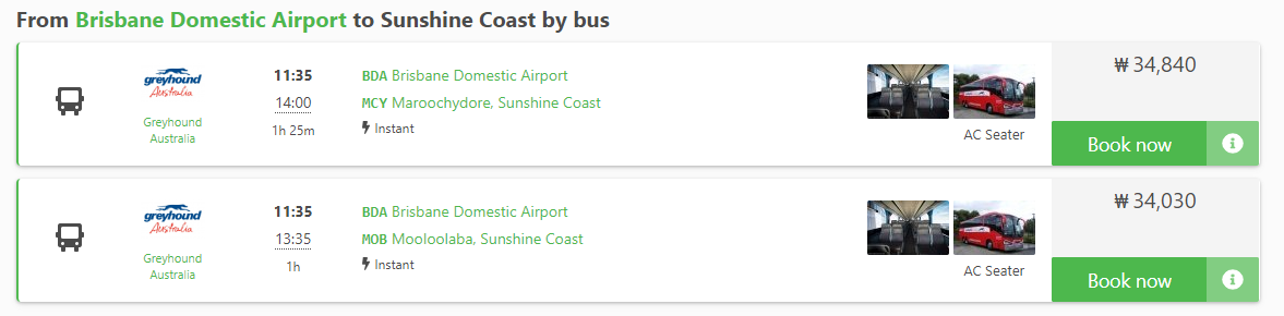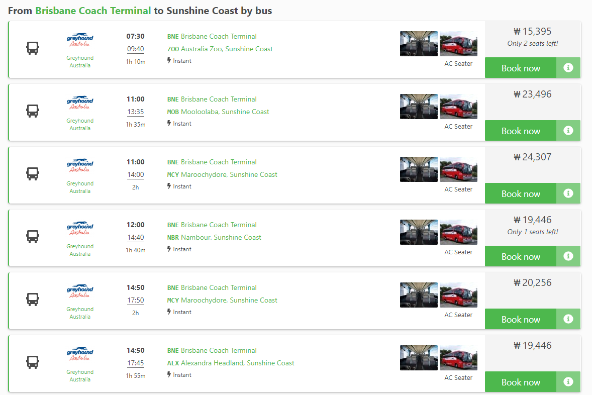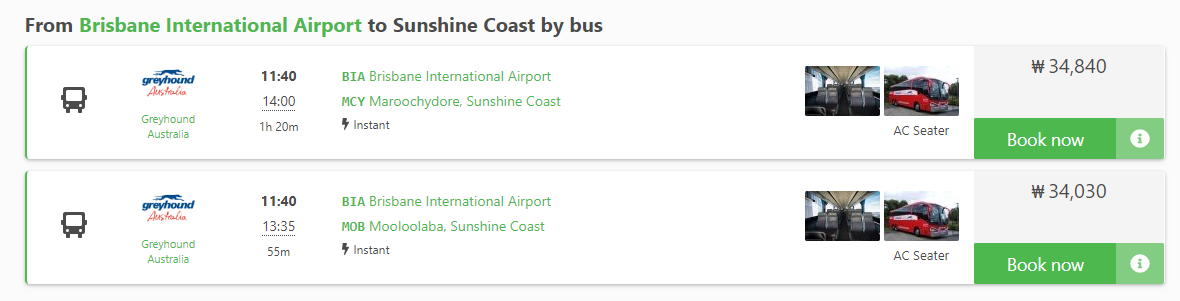 브리즈번에서 선샤인코스트 이동하는 버스는 아래와 같은 노선이 있습니다.